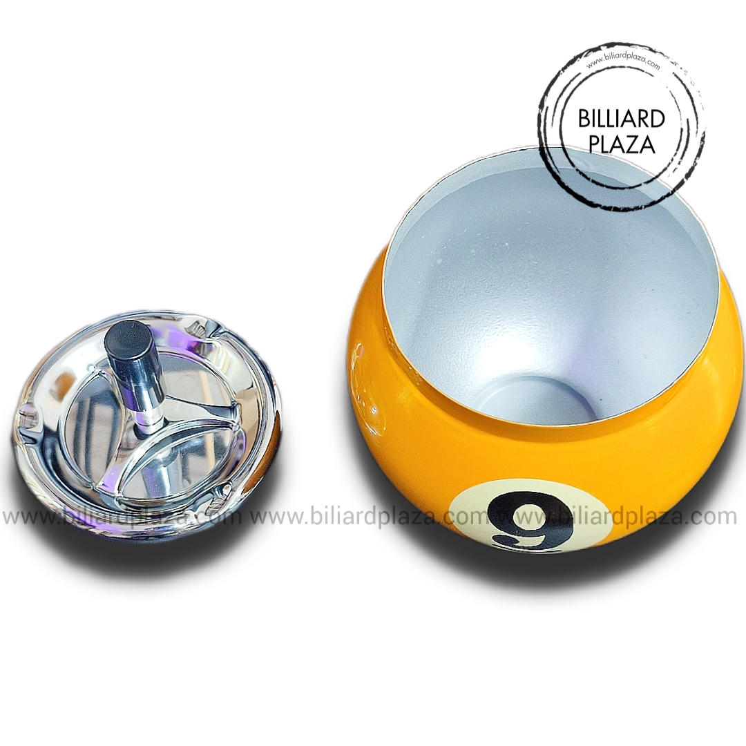 این زیرسیگاری فلزی با طرح توپ بیلیارد دارای مخزن بزرگ برای خاکستر بوده که با فشار دادن شستی روی در، خاکستر ها به داخل مخزن ریخته میشوند.